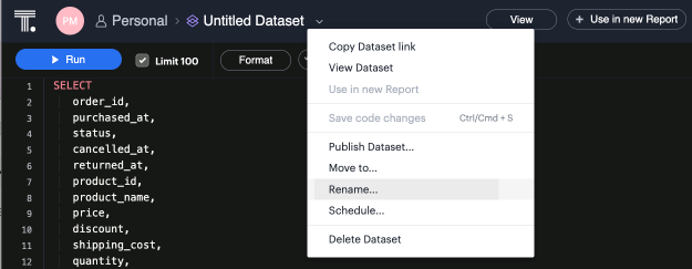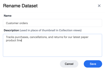 You can add a name and description to the Dataset. To do so, select the caret next to the placeholder name, “Untitled Dataset.” From the dropdown, select Rename.