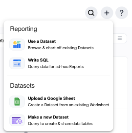 Datasets are encrypted tables stored in ThoughtSpot and refreshed at a user-defined interval. Datasets can be created by either querying a database or uploading a Google Sheet. To create a new Dataset, select the Create button in the top right corner of your Analyst Studio home screen and choose Make a reusable Dataset.