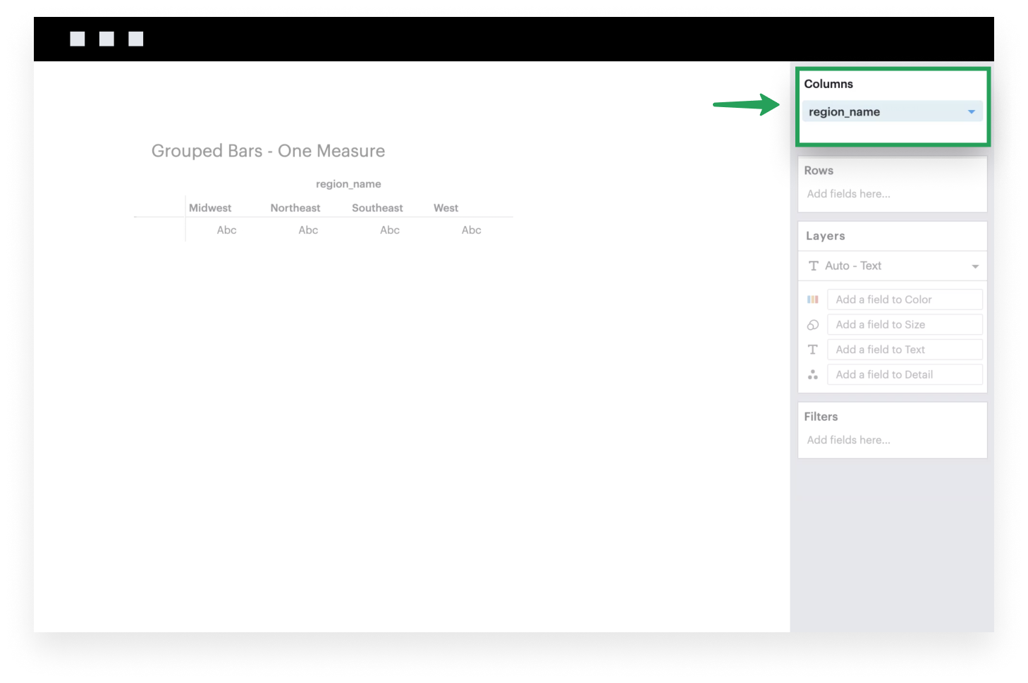 1. Add a dimension to Columns. This discrete field will be plotted along the x-axis of your visualization, with groups formed based on the unique values within this dimension.