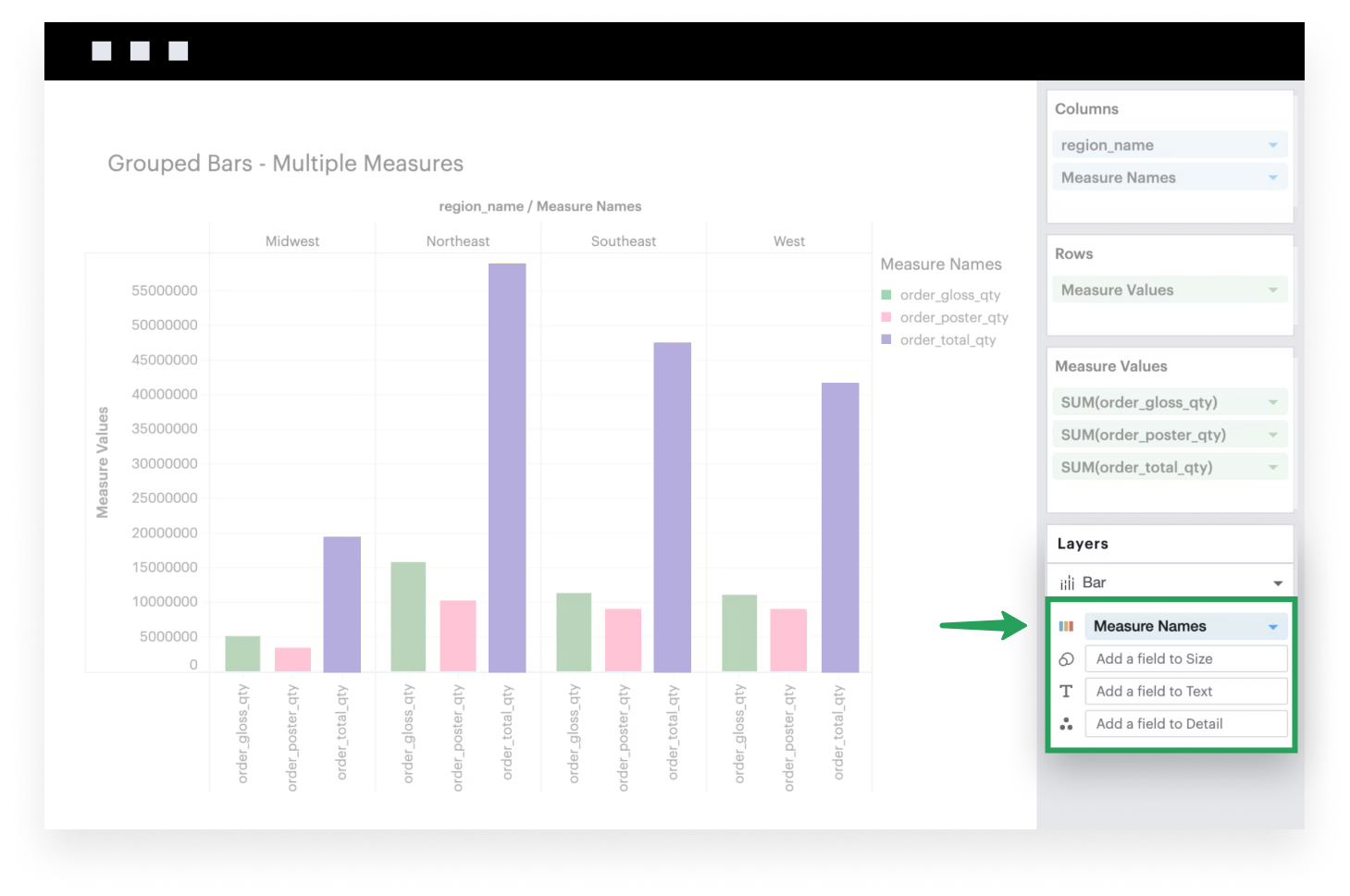 3. Add continuous fields to the Measure Values shelf to plot them on your visualization. These fields will be plotted along the y-axis of your visualization, where the heights of your bars are determined by the values of your fields within each x-axis group. You can think of the Measure Values field as a placeholder or variable that references the list of measures you add to the Measure Values shelf.