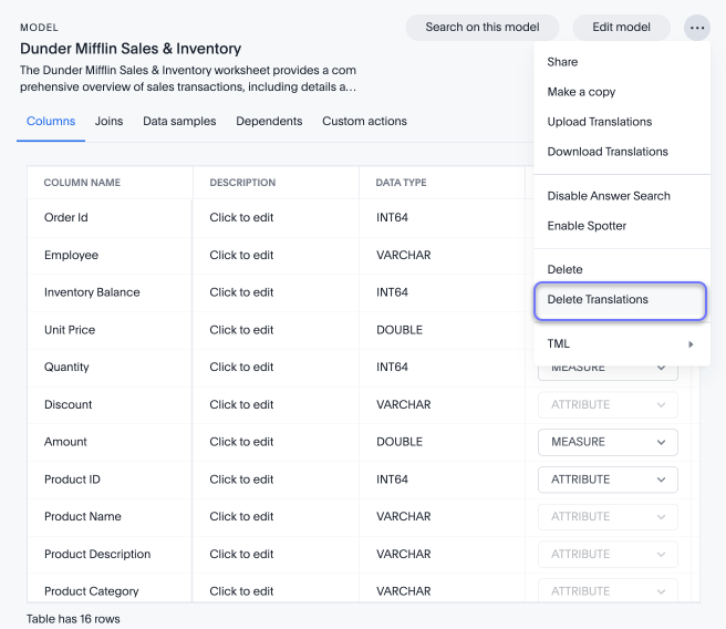 Deleting an alias file removes the alias definitions for the Model or Worksheet from ThoughtSpot. After deletion, column names revert to their default names.To delete an alias file, follow these steps: