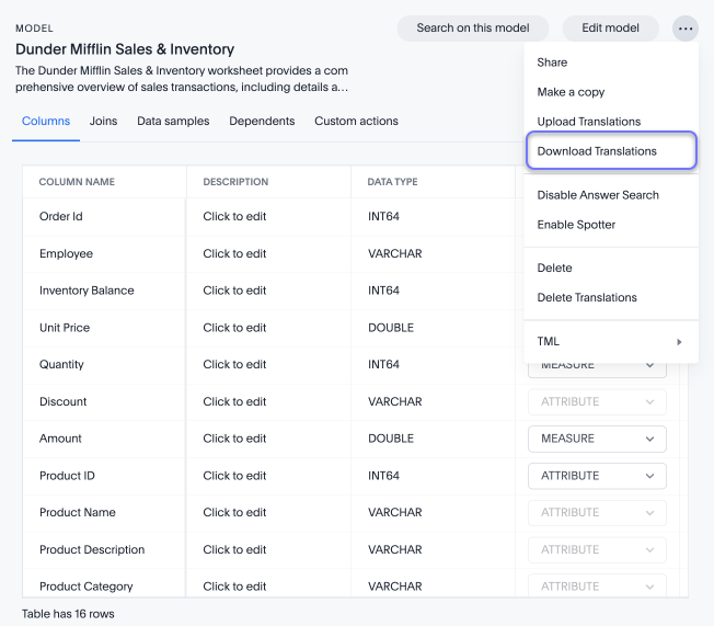 You can also set column descriptions in other languages to be displayed according to the system language you choose. Column aliases and localized column descriptions are stored in an internal variable store linked to the corresponding Model or Worksheet within ThoughtSpot, and can be updated by uploading a new CSV file of the same format. Note that updating aliases is not an incremental process– updating the definition replaces all previous aliases.