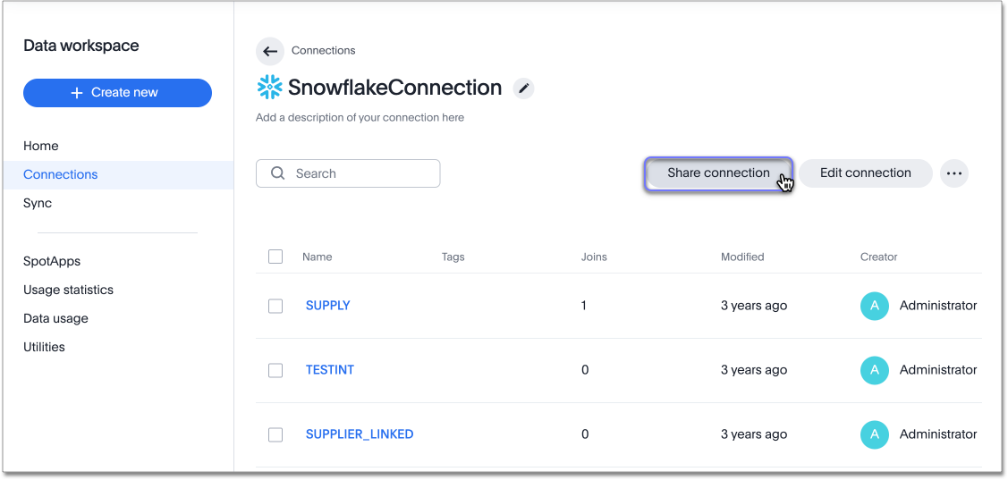 Users with can manage data or admin privileges can now share connections with other users or groups that have can manage data privileges. Once granted access to a connection, users can add, remove, and modify tables in that connection.