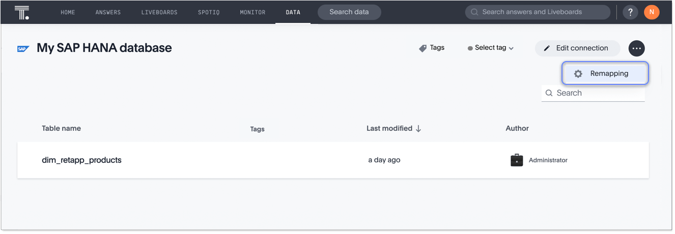 Modify the connection parameters by editing the source mapping yaml file that was created when you added the connection. For example, you can remap the existing table or column to a different table or column in an existing database connection. ThoughtSpot recommends that you check the dependencies before and after you remap a table or column in a connection to ensure they display as intended.