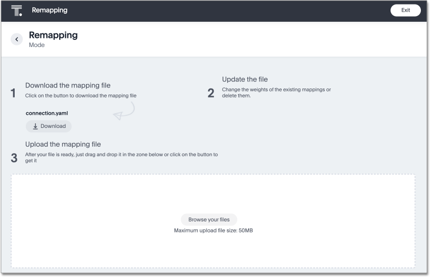 On the Remapping page, select Browse your files, and upload your edited mapping file to update the mapping of your connection.