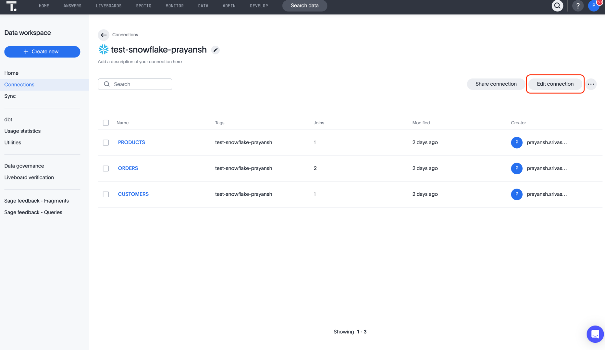 2. Navigate to the Data workspace and select Connections from the left menu. Select the desired Snowflake connection that is currently authenticated using a password-based service account.