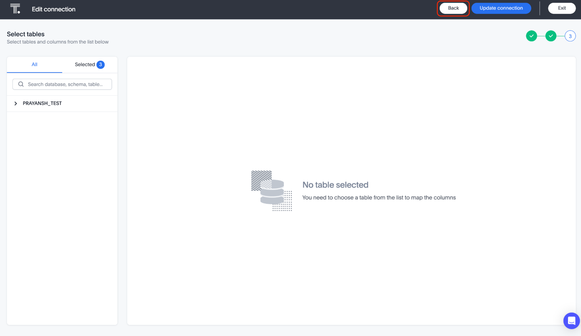 3. Select Edit connection. The Select tables page appears. Click Back.