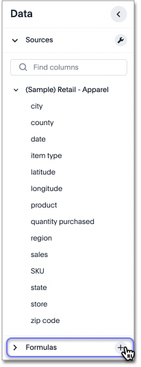 5. In the Data side menu, scroll to Formulas and select the + icon. If the new Answer experience is off in your environment, select the more options icon more options menu icon in the upper-right side of the table, and select Add formula.