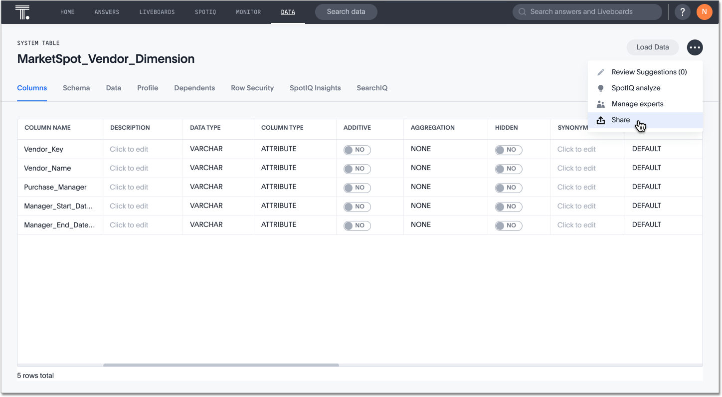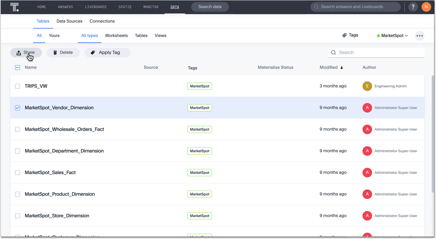 When you share a Worksheet, you give users or groups within your cluster access to the Worksheet’s data. You share all of its columns. Sharing a Worksheet does not share the underlying tables. If you want to share the underlying tables, see Sharing tables and columns.