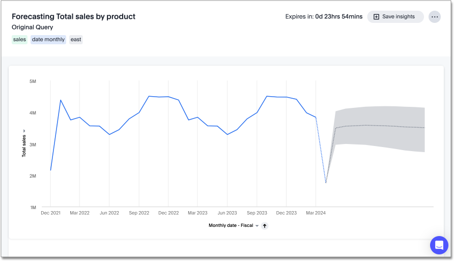 8. To save the forecast visualization, select Save insights. You can also click the More icon More menu icon to share the forecast with other users or groups, or to delete the forecast.