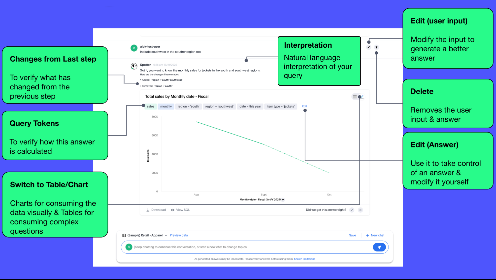 Let’s take a look at the Spotter user interface to understand how users can use the various options available. Spotter is designed as a conversational experience. The image below highlights some of the key elements: