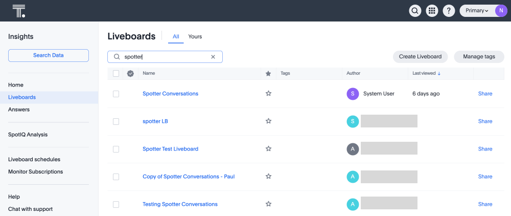 To view this Liveboard, navigate to the Insights tab, select Liveboards from the left menu, and search for Spotter Conversations.