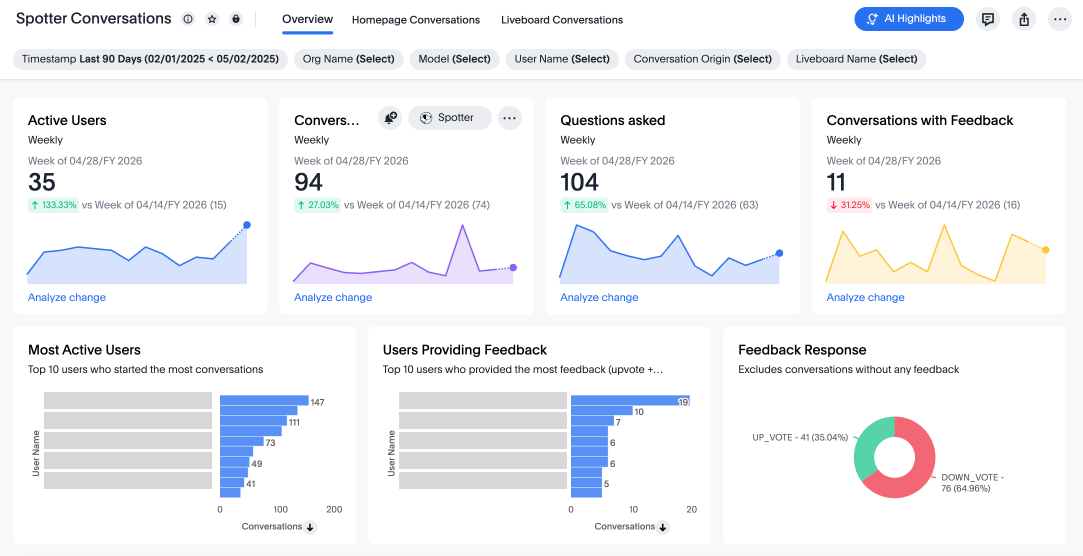 Use the Spotter Conversations Liveboard to get insight on how your users are interacting with Spotter. You can gain insight into user engagement and adoption metrics for Spotter, track query trends and understand user intent, monitor follow-up actions (including query refinements and edits within conversations), and analyze feedback to identify training gaps and improve dataset coverage.