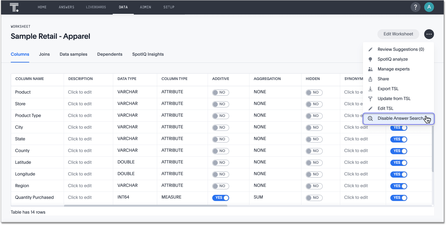 Note that you can re-enable Answer Search on that Worksheet in the same way, by clicking the More menu more options menu icon and selecting Enable Answer Search. It can also take about 6 hours to re-enable. When your Worksheet is fully published and no longer a work in progress, don’t forget to re-enable searching for existing objects on it!