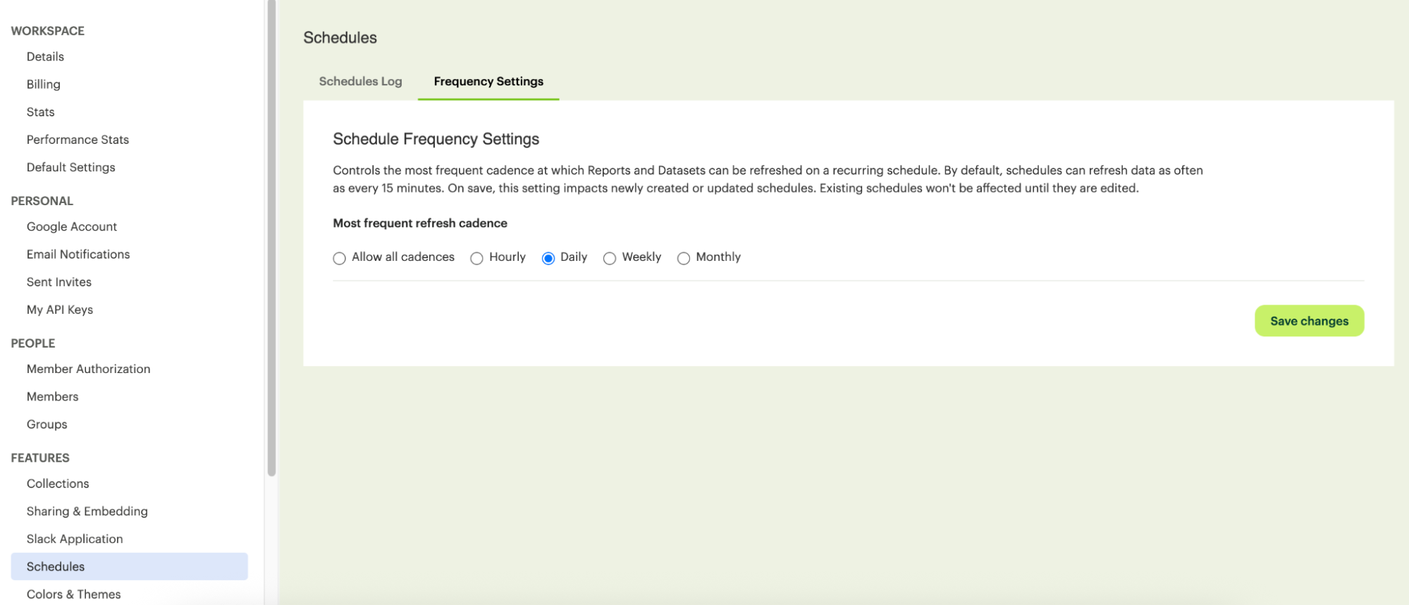 Even after an administrator sets a workspace-level frequency policy, existing schedules will not be impacted, regardless of whether they comply with the new policy.