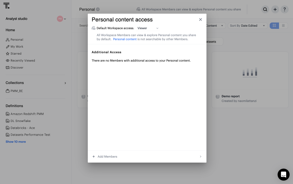 (Recommended) Keep the default access set to Viewer if you want users in your Workspace to be able to view personal content you share with them. Note that other users cannot navigate to or search for your personal content. They can only view the Report if you share the link with them.