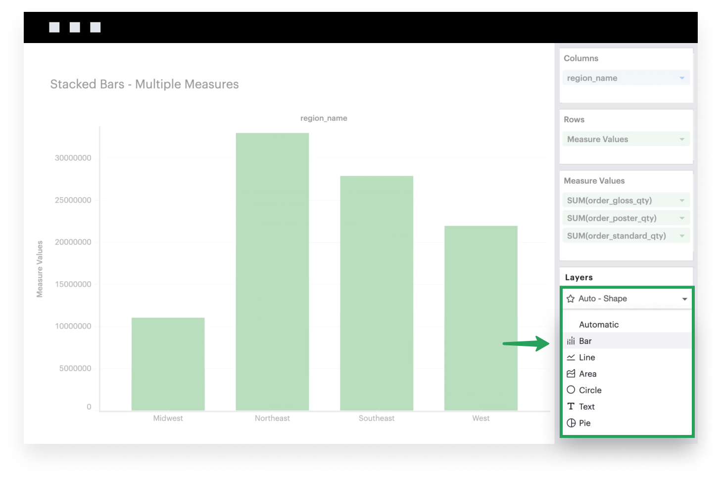 Add continuous fields to the Measure Values shelf to plot them on your visualization. These fields will be plotted along the y-axis of your visualization, where the heights of your bars are determined by the values of your columns within each x-axis group. You can think of the Measure Values field as a placeholder or variable that references the list of measures you add to the Measure Values shelf.