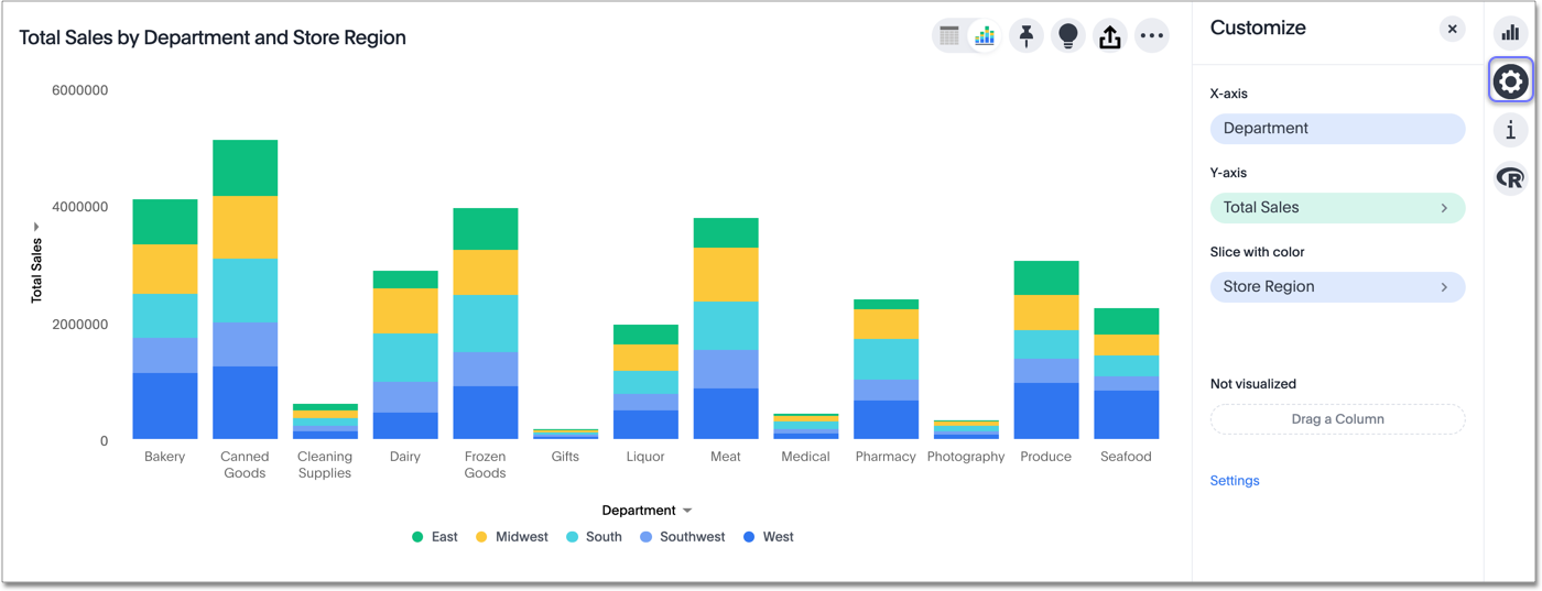 You can only add attributes to the x-axis, and measures to the y-axis. If you cannot add a column to a specific axis, the option to do so does not appear to you when you attempt to drag and drop the column. Attributes appear blue in the search bar and in the Customize menu, while measures appear green.