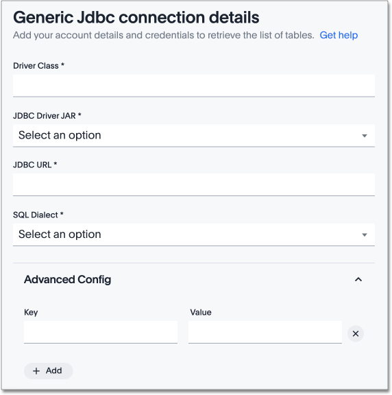 Refer to the Generic JDBC connection reference for more information on each of the specific attributes you must enter for your connection. Note that you must create a support ticket to have ThoughtSpot upload your JDBC Driver JAR(s) before you can create a connection.