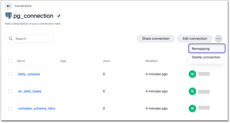 To remove a table from a connection, delete it from the connection details page. For more information, see: Delete a PostgreSQL connection.