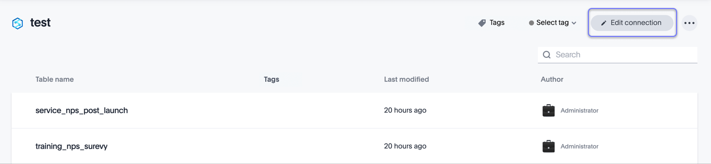 By default, the Select tables page appears. You have the option, though, to change the connection name and update the connection details, by selecting the appropriate option at the top of the screen, making any changes needed and selecting Continue to go to the next page.