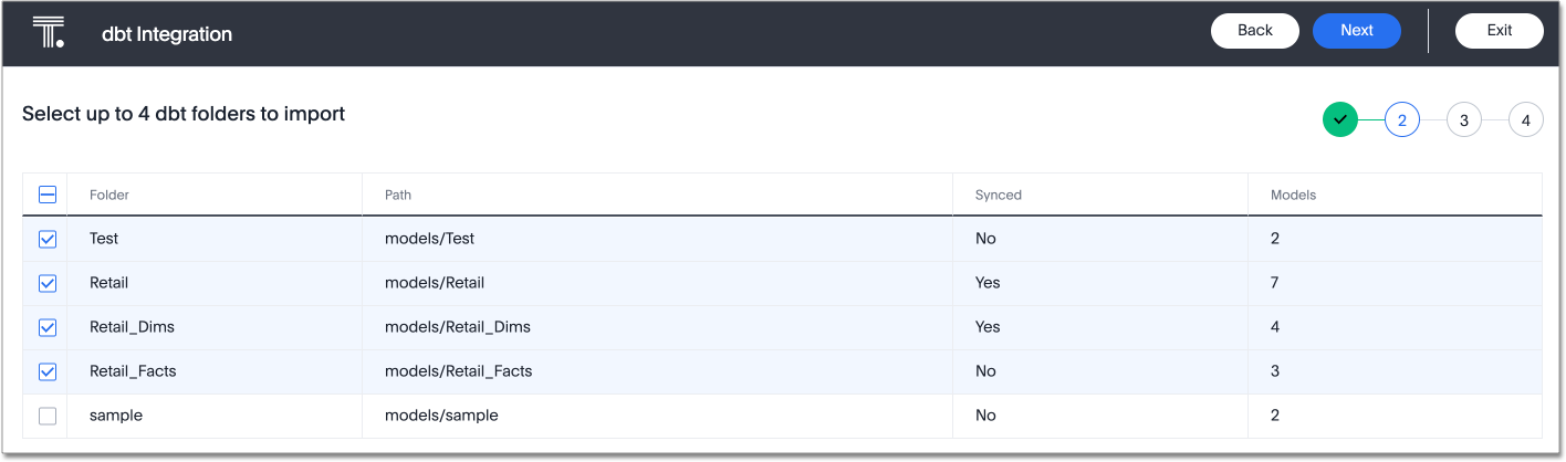 14. On the next screen, select up to 4 dbt folders to import. ThoughtSpot lists the model names, paths, and the number of tables they have.