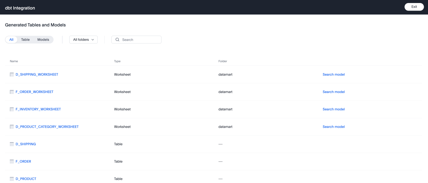 19. The Generated Tables and Models page appears. ThoughtSpot generates several tables and Models from your dbt models.