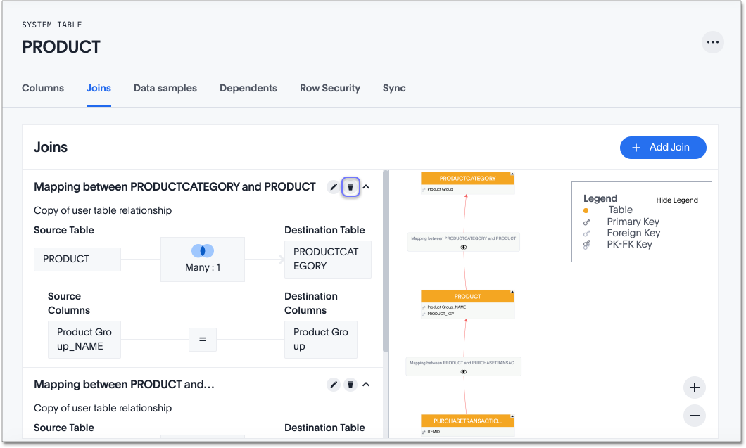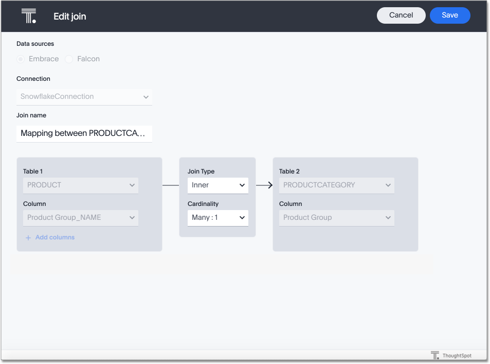 ThoughtSpot allows you to edit the name, join type, and cardinality through the web interface. To change the columns that define a join, you must delete the join and create a new one.