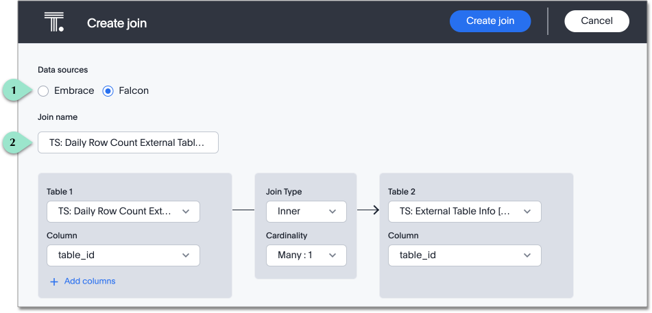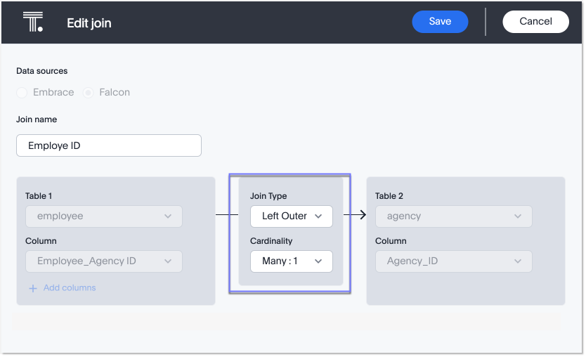 A join combines columns from one or more sources in your data by using matching values. By defining relationships between your sources, you create a new, richer set of data that you can use to answer your business questions. Choose a column to join on that both data sources contain (for example, employee ID or product key). This process creates a generic join between the source table or view, and the target table or view on the column you specify.