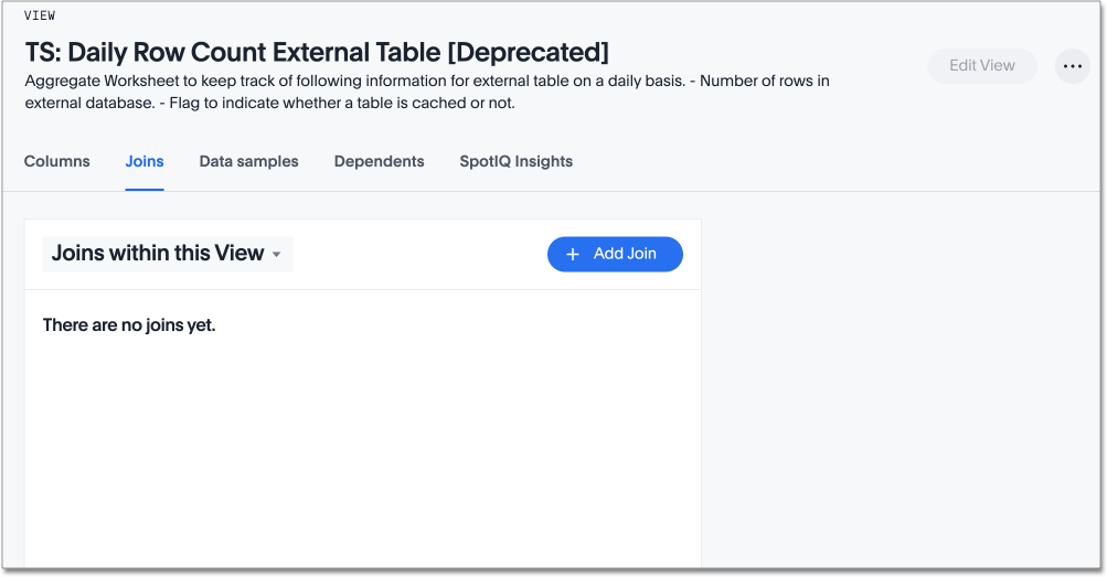 Select the Joins tab. The list of existing joins from the table, Model, or view appears.