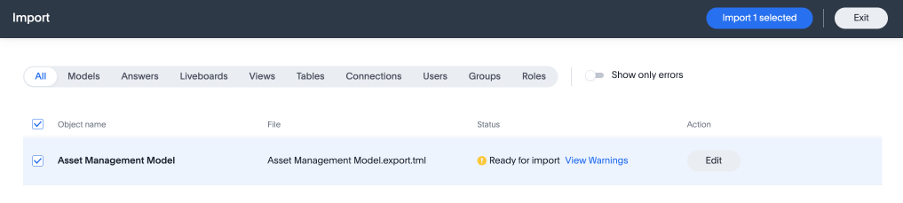 5. The Import screen appears, showing the object name, file name, status, and possible actions. You can select Edit to edit the TML file. When ready, select the checkbox next to the file or files and click Import n selected.