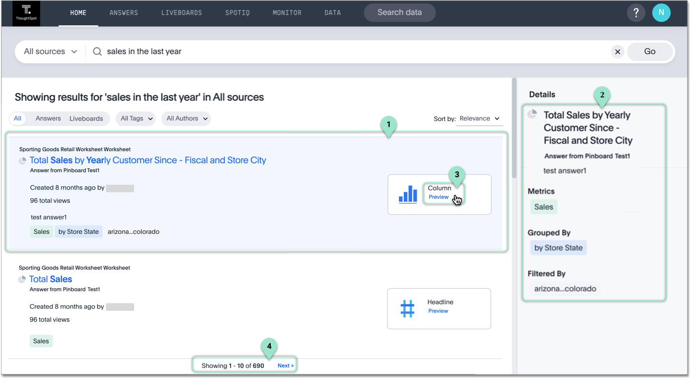 The list of results of your selection appear. Note that ThoughtSpot automatically selects the first result and opens the Details panel. This allows you to quickly glance at the metrics, groups, and filters for the Answer or Liveboard that ThoughtSpot determines is most useful for you.