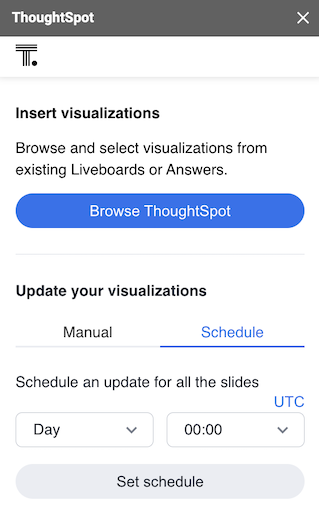 You can also schedule a periodic update of all the visualizations in your Google Slides presentation. There is an option of setting up the schedule for the Day, Week, or the Month.