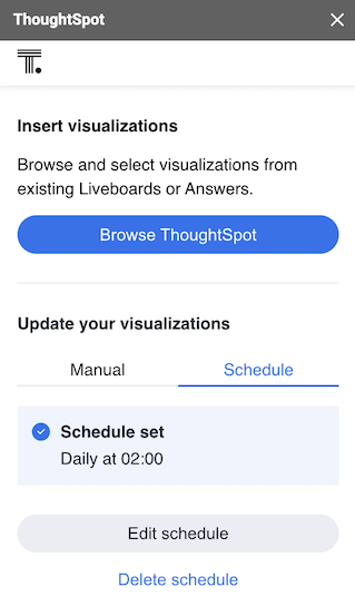 You have two options for updating visualizations available from the first page of the ThoughtSpot Connected Slides panel.