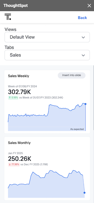 Starting ThoughSpot Cloud release 10.6.0.cl, ThoughtSpot Connected Slides will also support Personalized views. You can choose the Views and Tabs and insert them into your Google Slide by clicking the Insert into slide option on the visualization.