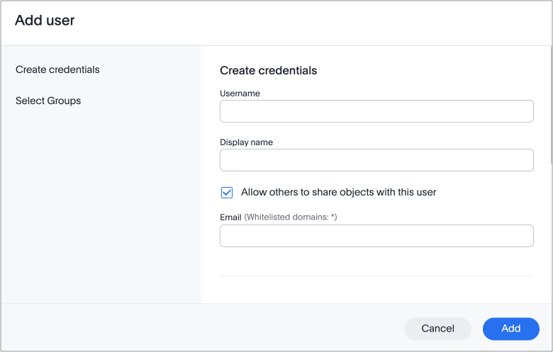Username, Display name and Email are mandatory fields and cannot be left empty. If you attempt to add a user with the same user name as an existing user you will encounter an error. User names must be unique. - Username