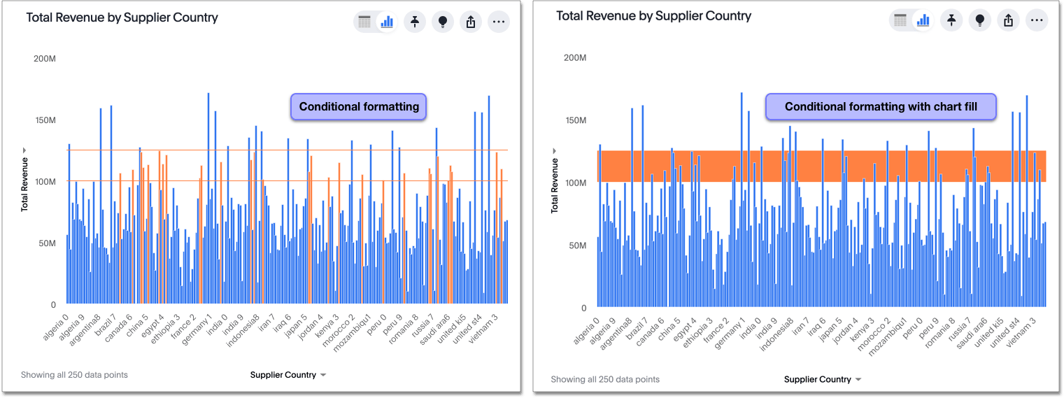 To apply conditional formatting to a chart (in this example, Total Revenue by Supplier Country), follow these steps: