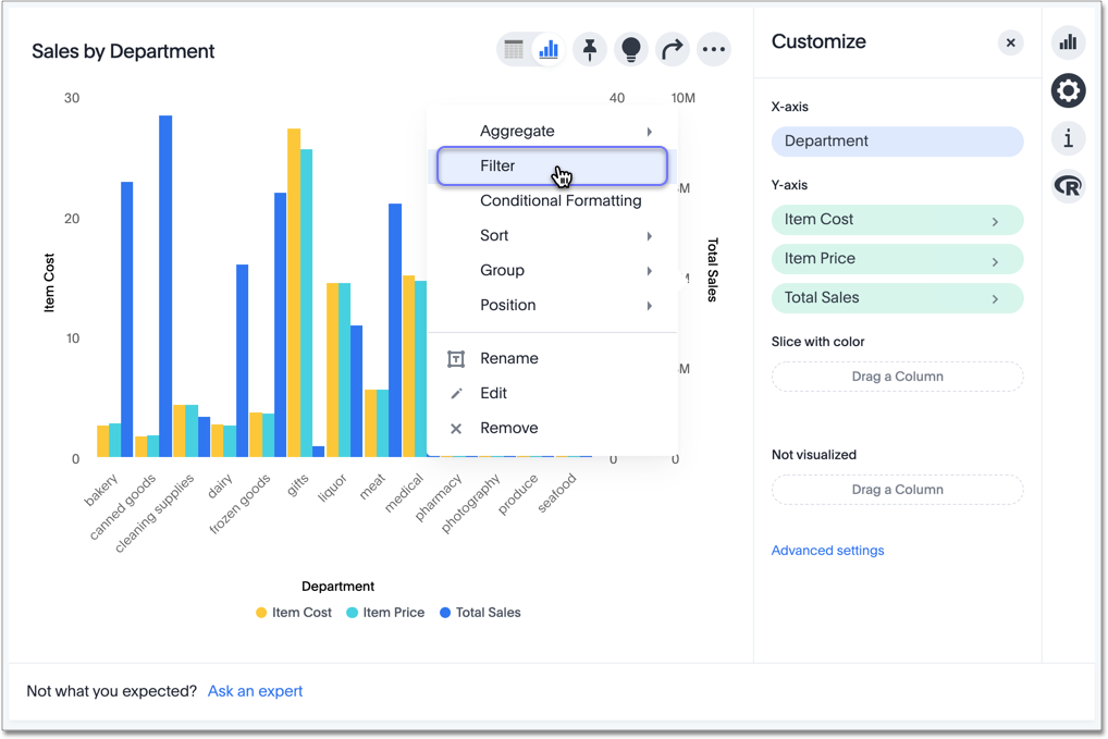 To manage the filters applied to the axis (in this example, Total Sales), follow these steps:
