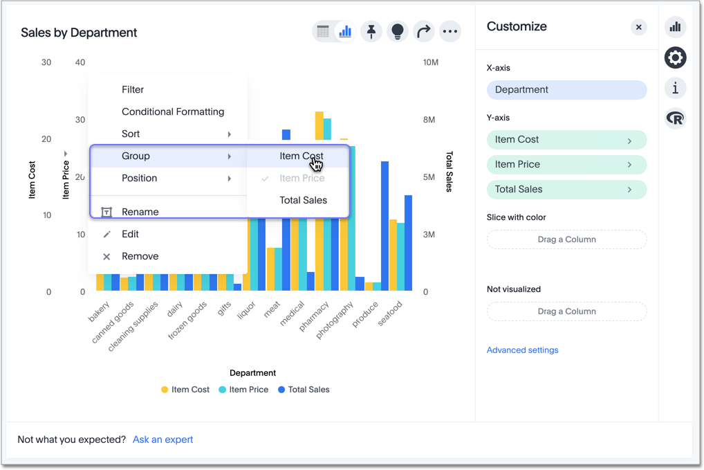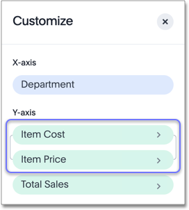 In our example, it makes sense to rename the axis created from grouping as Item Price & Item Cost to something shorter, like Item Price and Cost.
