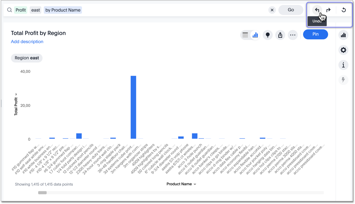 As you work with charts and chart configuration, you may want to undo or redo an action. Use the in-product undo, redo, and reset buttons to reset or go back or forward 1 step each time you make a change in a search or saved Answer (for example, when you add a new column to the search, drill down, or sort). These buttons appear to the right of the search bar in a search or saved Answer. Note that the reset button is only available for saved Answers; it resets the Answer to its last saved state.