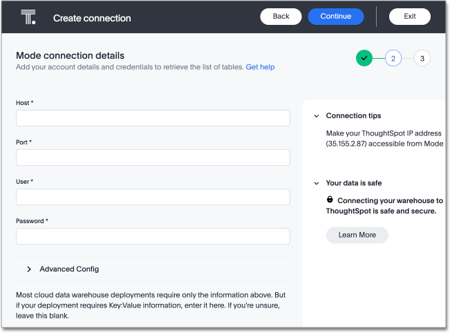 | Mode connector is in Early Access and off by default. To enable it, contact ThoughtSpot support. |
