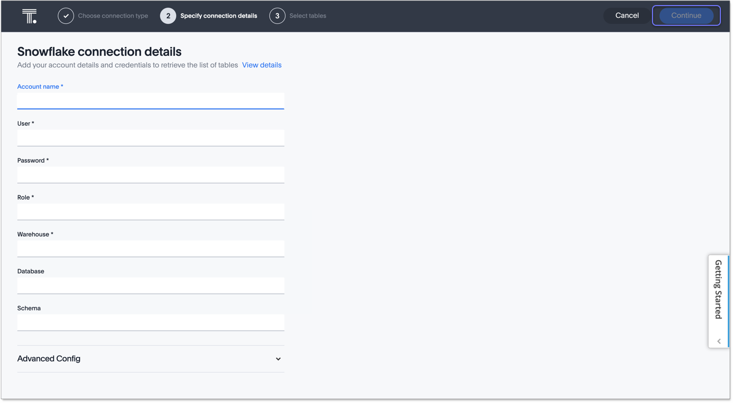 6. Add a connection to Snowflake in ThoughtSpot, specifically to the view you created.