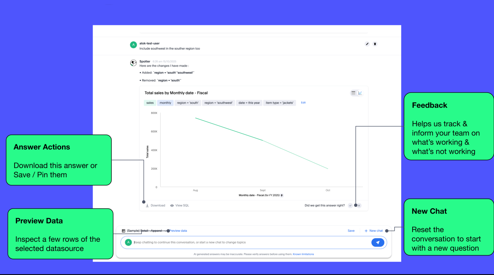 Let’s take a look at the Spotter user interface to understand how users can use the various options available. Spotter is designed as a conversational experience. The image below highlights some of the key elements: