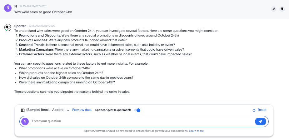 AI context for Models is now on by default. You can now add AI context to columns in any Model where you have Can Edit access. This context helps Spotter better interpret a column and its values, using this knowledge to differentiate between similar columns and answer your data questions more accurately. You can auto-generate this context automatically with a single click to get started.