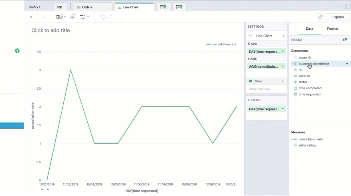 SUM(CASE [Status] WHEN 'CANCELLED' THEN 1 ELSE 0 END)/SUM(1).This formula checks for whether the order status was cancelled. It will sum up the tally of cancelled orders and divide by the total number of rows to calculate the cancellation rate.