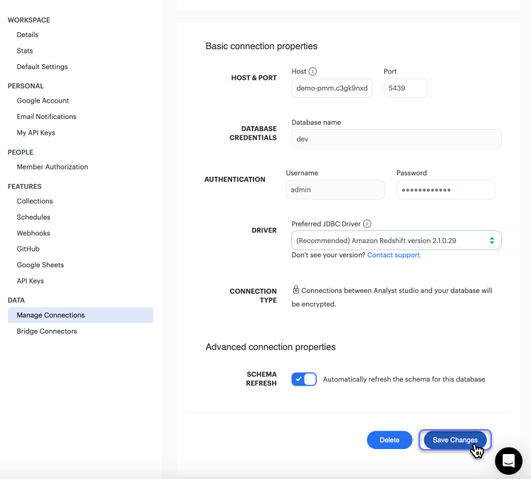 Click on the connection and then go to the Connection Properties tab to adjust the database credentials and configuration. Click Delete to disconnect this database from Analyst Studio.