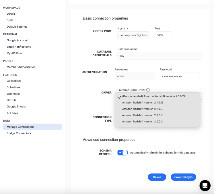 You can only delete or modify the settings and credentials for a database connection if you’re an admin or if you were the member who connected it to the Workspace.