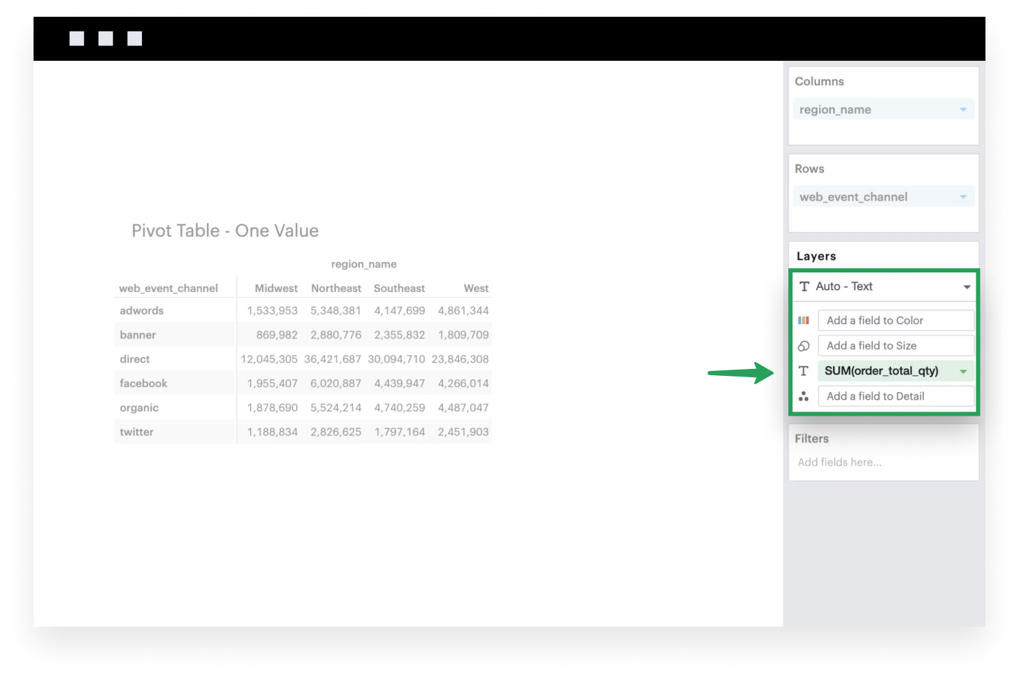 Add discrete fields to either Rows or Columns. These are the groups that you want to aggregate your value by. You can have as many groups as you’d like.