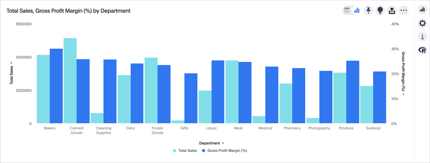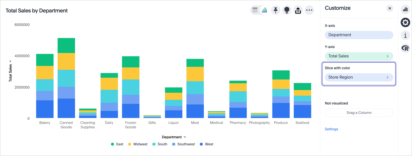 Selecting a legend item will hide it from the chart, but does not delete it from your search. Select the legend item again to show it. The legend appears when you have more than one column on an axis, or when you slice with color. To hide and show values: