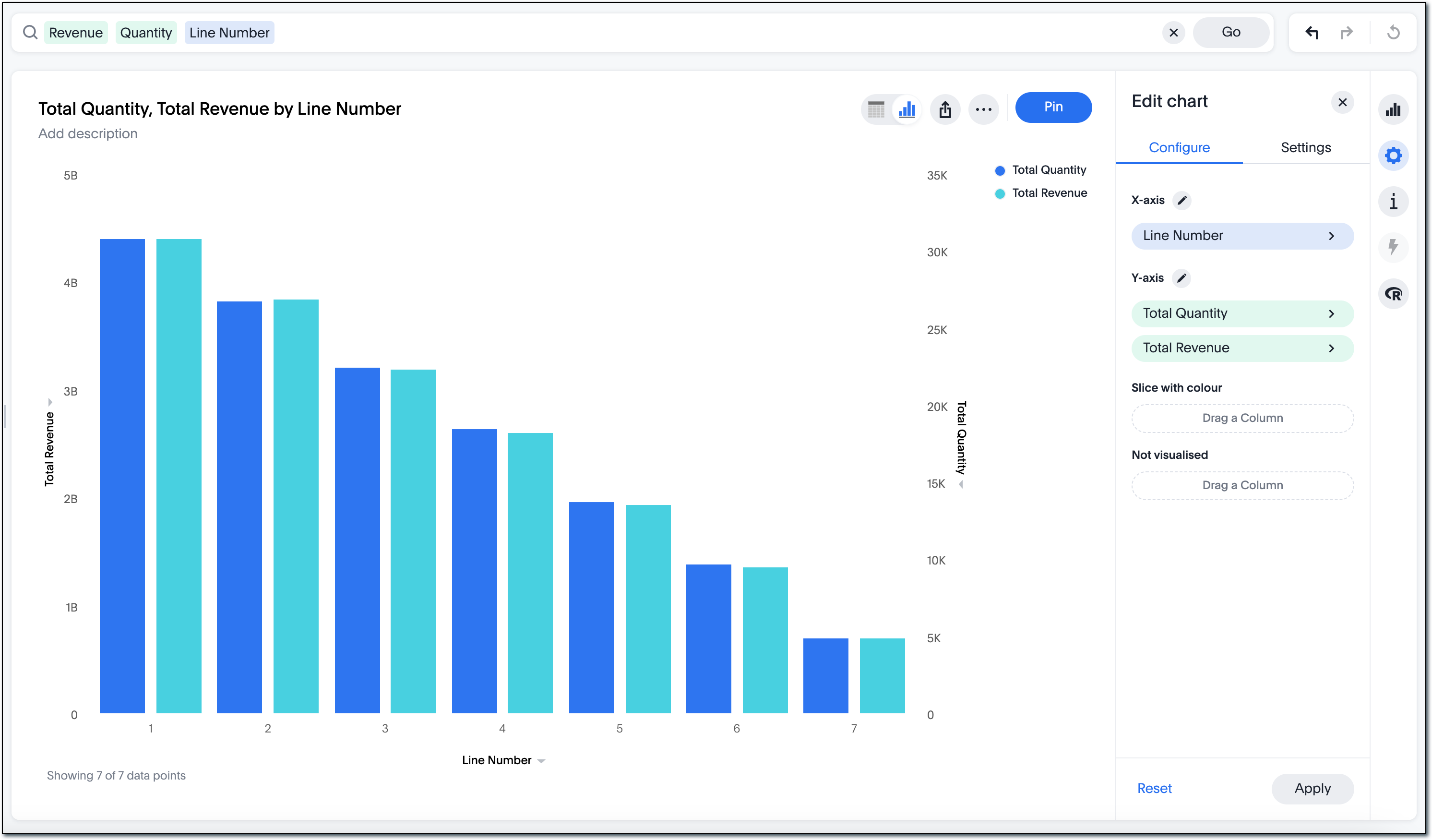 If you close the Configure menu, open the Settings menu, or open the chart selection menu before selecting Apply, ThoughtSpot does not make your changes.